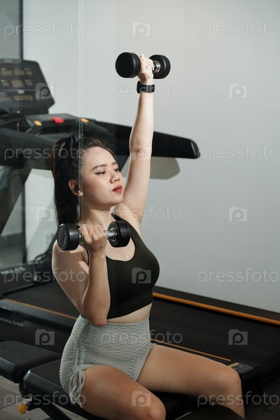 Молодая женщина поднимает гантели