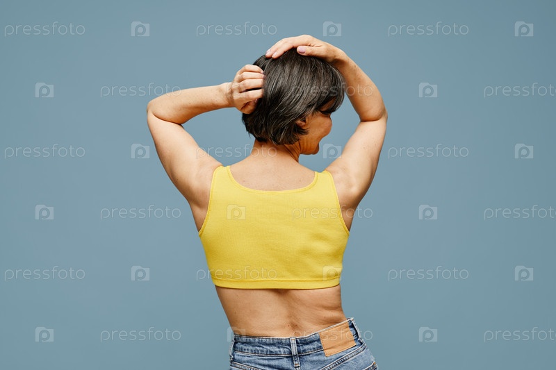Зрелая женщина танцует на синем