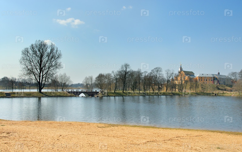 Озеро, мост и замок в Несвиже, Беларусь