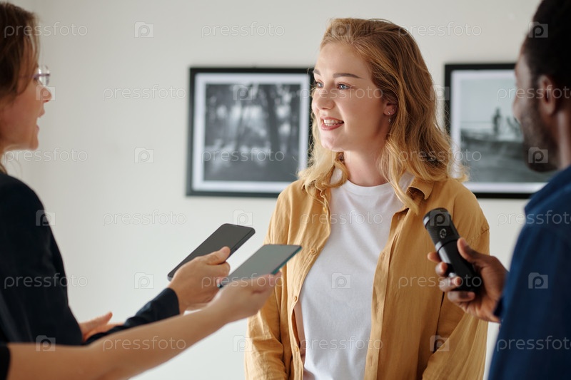 Молодая уверенная в себе блондинка отвечает на вопросы журналистов
