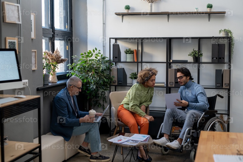 Два молодых многорасовых сотрудника обсуждают документ в офисе
