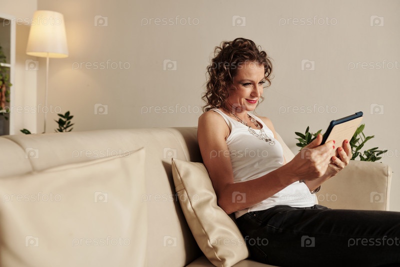 Женщина читает статью на планшетном компьютере