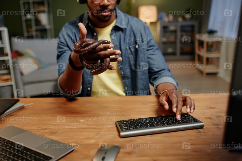 Близкий план молодого бизнесмена с крысиной змеей, обвязывающей его руку