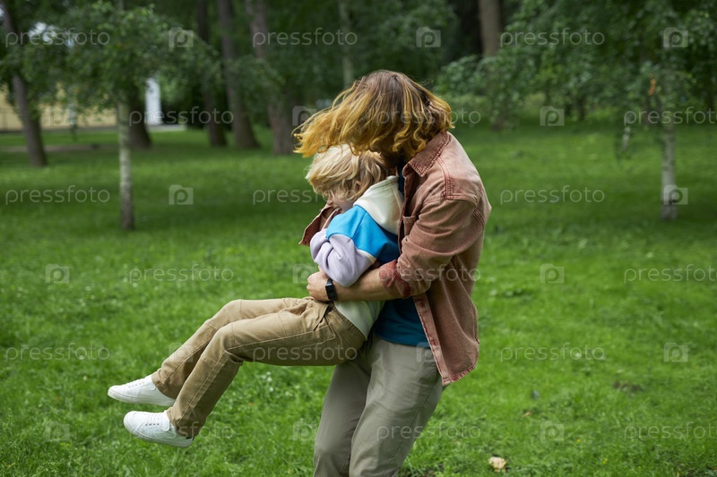 Счастливый отец играет с маленьким ребенком в парке и вращается по кругу