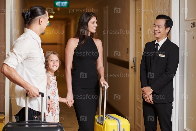 Рецепционистка показывает семье свою комнату