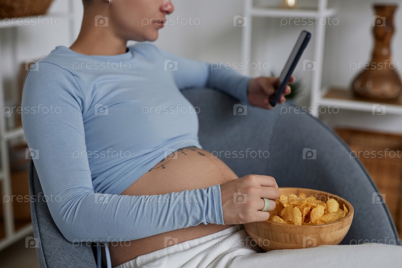 Ближайшее изображение беременной женщины, использующей смартфон, ест чипсы и отдыхает дома