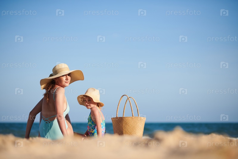 Мать и дочь загорают на пляже