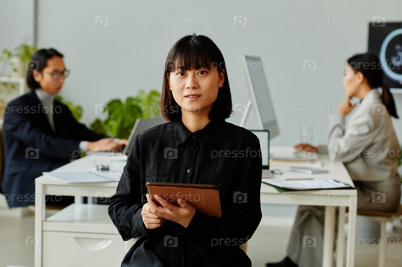 Молодая азиатская бизнесвуменка смотрит на камеру