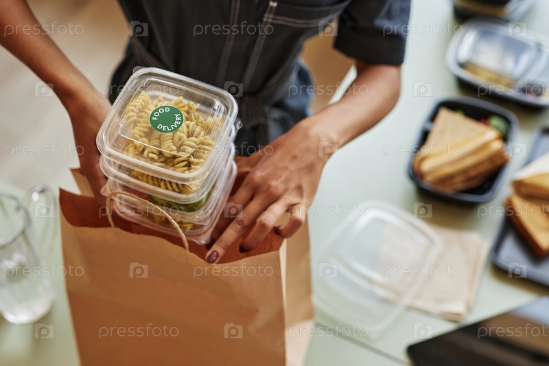 Молодая чернокожая женщина упаковала заказ на доставку еды в бумажный пакет