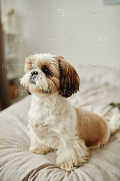 Гордый маленький пес, сидящий на кровати дома в уюте