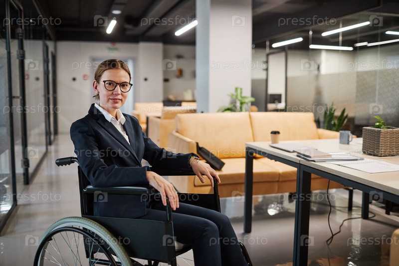 Деловая женщина, использующая инвалидное кресло в современном офисе