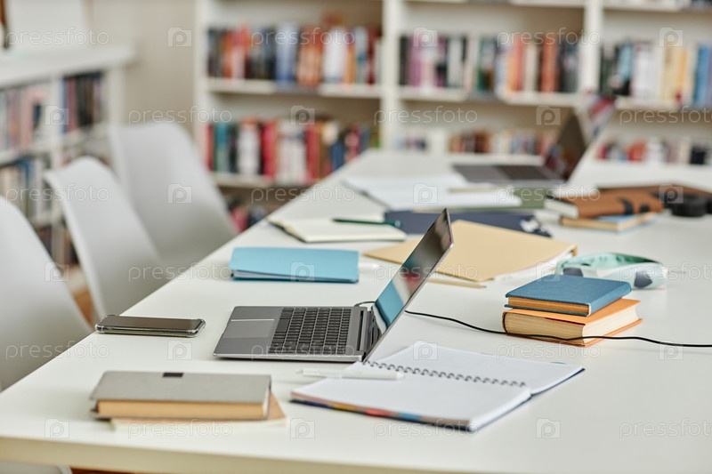 На заднем плане изображение рабочего стола в библиотеке колледжа с ноутбуками и записками