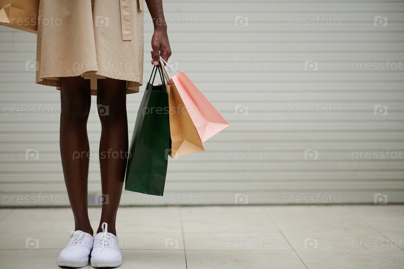Обрезанное изображение молодой женщины, несущей сумки с одеждой и обувью, которые она купила в торговом центре