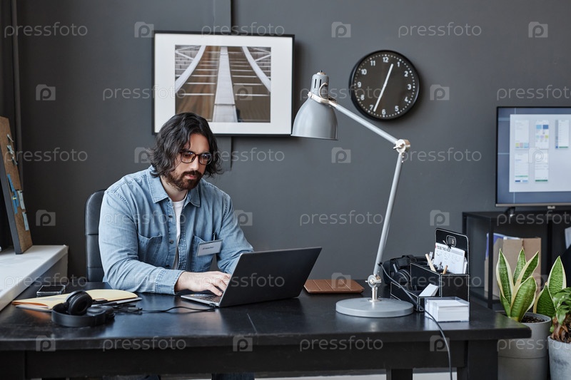 Бородатый мужчина использует ноутбук, работает за столом в офисном интерьере в темных цветах