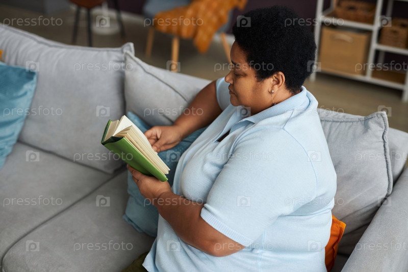 Боковой вид старшей чернокожей женщины в футболке, отдыхающей на диване с книгой