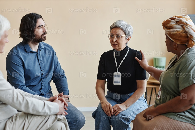 Пожилые люди в кругу группы поддержки психического здоровья со зрелой азиатской женщиной