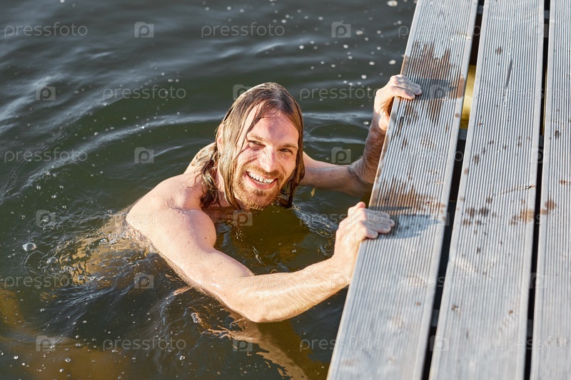 Молодой человек плавает в озере