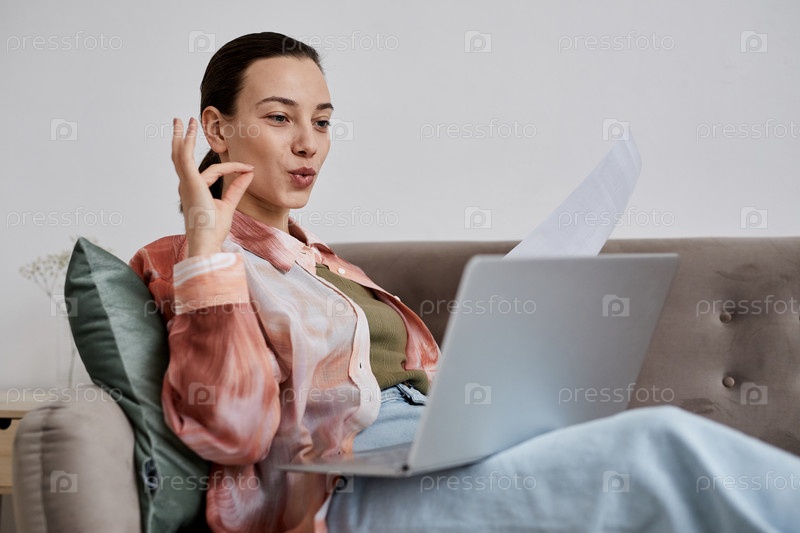 Молодая самоуверенная репетитор с бумагой сидит на диване с ноутбуком на коленях