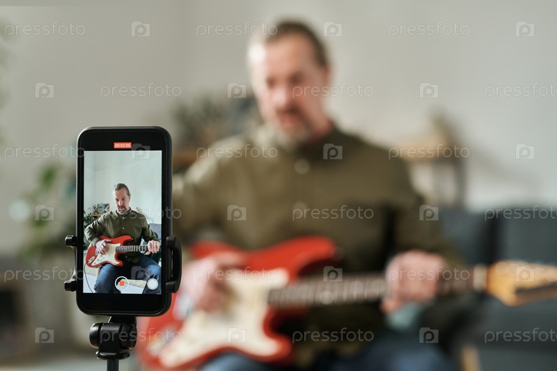 Гитарист записывает онлайн-уроки на смартфоне
