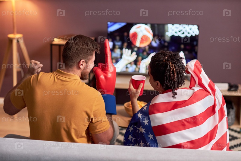 Два взволнованных болельщика спорта смотрят баскетбольный матч дома и радуются