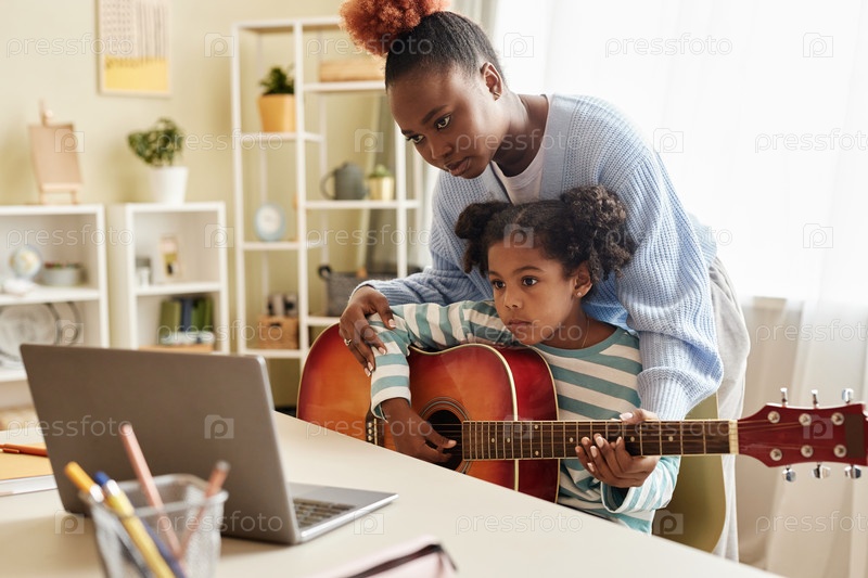 Черная маленькая девочка смотрит онлайн уроки музыки с матерью и играет на гитаре