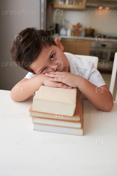 Усталый мальчик, опирающийся на кучу книг
