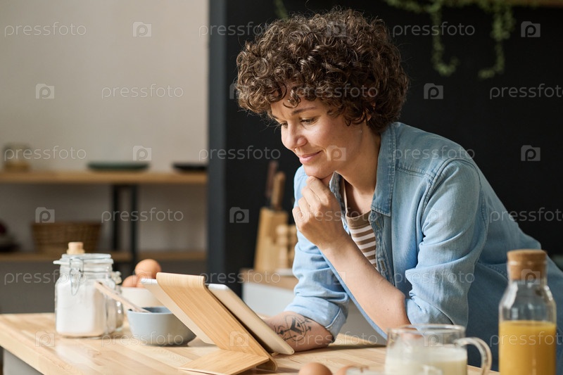 Женщина использует планшетный компьютер, чтобы смотреть кулинарное видео