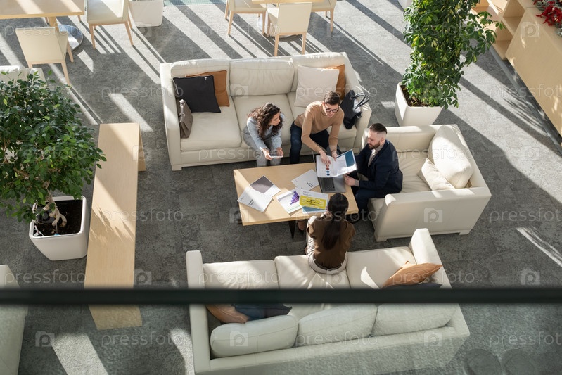 Современный молодой бизнесмен объясняет группу коллег данными в документе