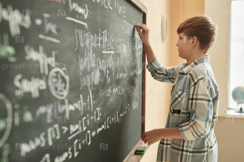 Боковой вид школьник, пишущий на доске в классе