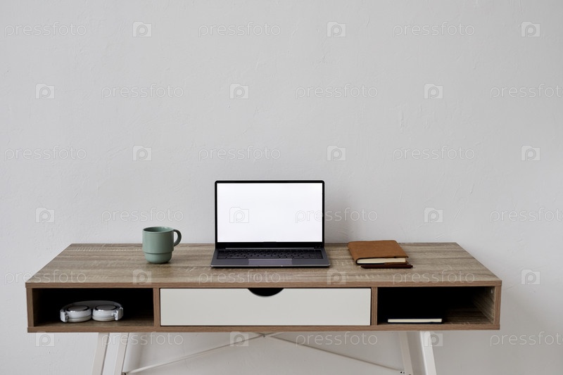 Передний вид ноутбука с пустым экраном, стоящим между чашкой и ноутбуком