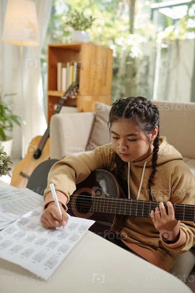 Девушка, наклонившаяся и играющая на гитаре