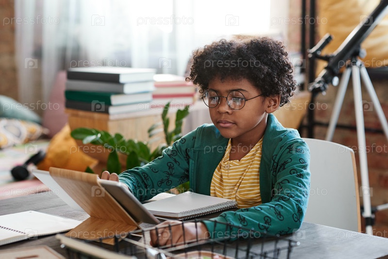 Маленький мальчик использует планшетный компьютер в своем кабинете