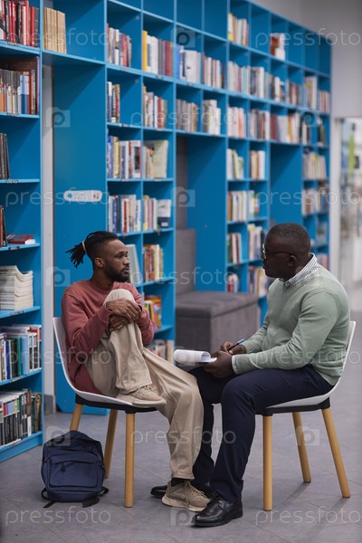 Молодой чернокожий студент разговаривает с терапевтом или консультантом по вопросам образования в колледже