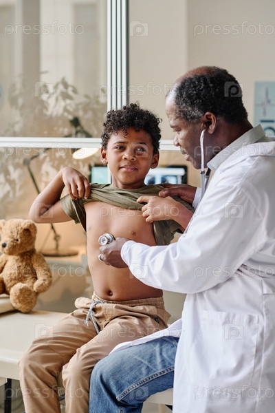 Маленький мальчик сидит в кабинете педиатра