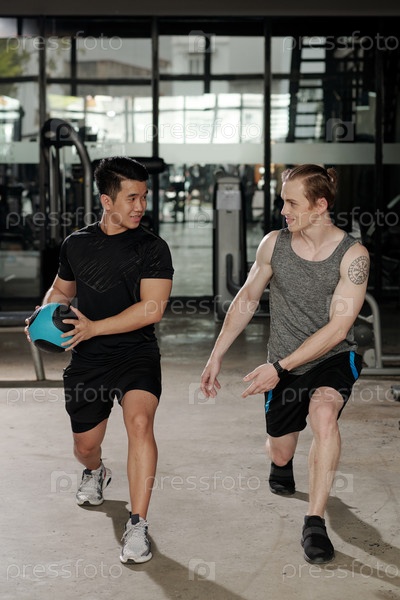 Тренер показывает упражнение клиенту