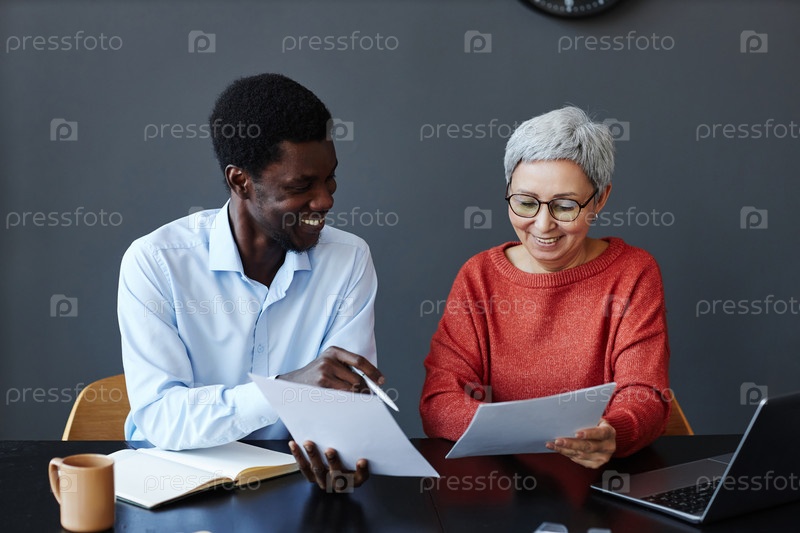 Старшая деловая женщина читает документы, работая с коллегой за столом в офисе