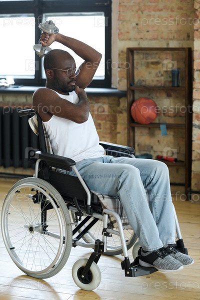 Мужчина с инвалидностью занимается гимнастикой на гантели