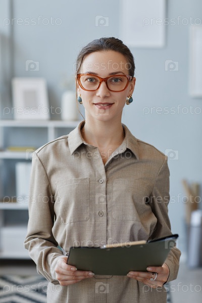 Деловая женщина смотрит на камеру, стоя у рабочего места