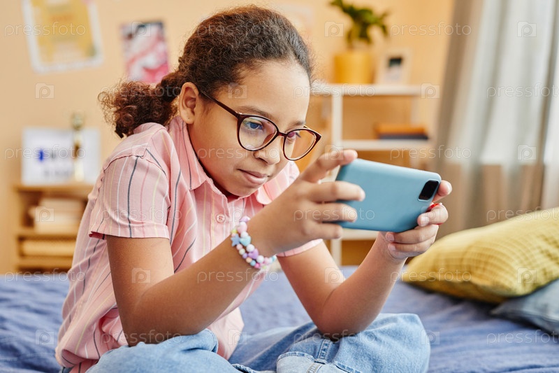 Серьезная афроамериканская школьница в очках смотрит на экран смартфона
