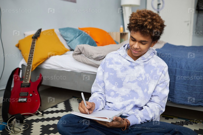 Молодой студент делает заметки в копийке, сидя у двуспальной кровати