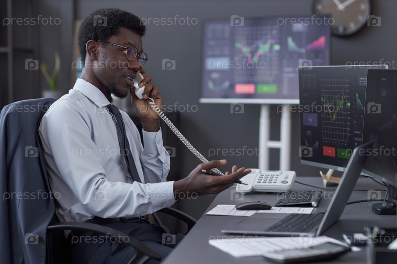 Афроамериканский брокер получает звонок по телефону