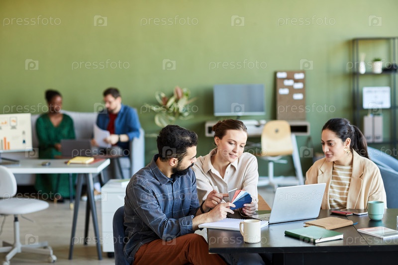 Группа молодых креативных дизайнеров, выбирающих цвета для нового продукта