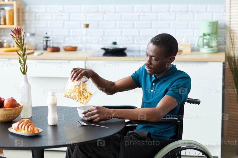 Человек в инвалидном кресле, делающий завтрак