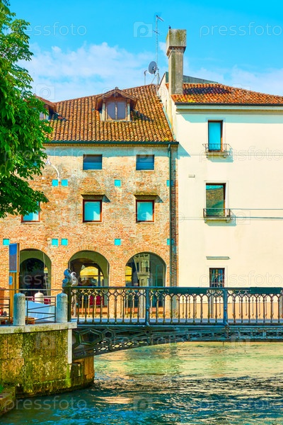 Старые здания и небольшой канал с мостом в Тревизо