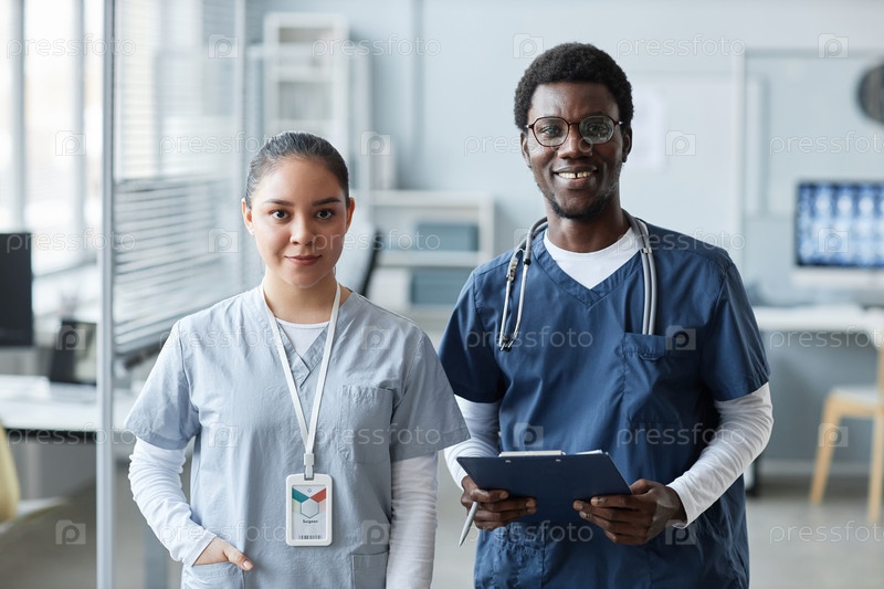 Две молодые успешные межкультурные помощницы в форме смотрят на камеру