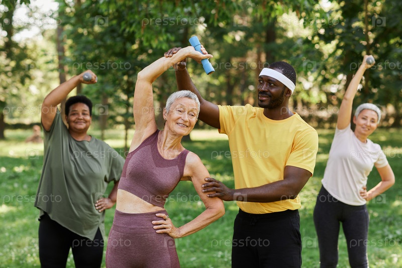 Мужской спортивный тренер, помогающий пожилой женщине наслаждаться видами спорта на открытом воздухе