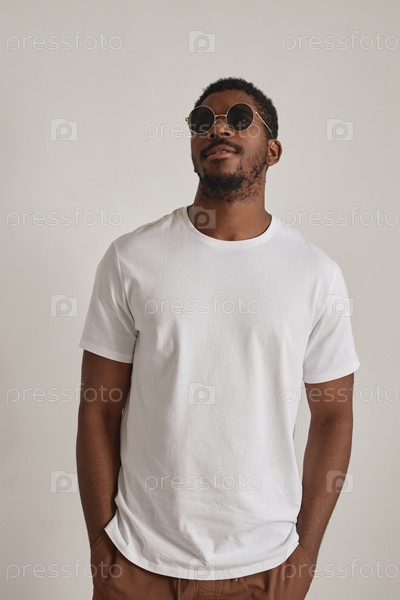 Красивый чернокожий мужчина в солнцезащитных очках на белом