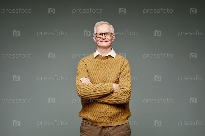 Современный пожилой седой бизнесмен в вязанном коричневом свитере