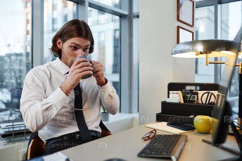 Бизнесмен в рубашке и галстуке пьет чашку кофе в офисе
