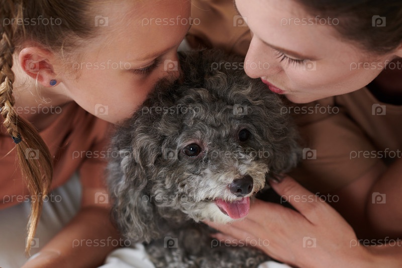 Мать и дочь целуют собаку